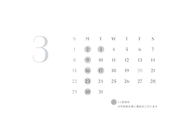 お知らせ 3月の定休日 purstaff 2026-02-28 【3月の定休日】 2,9、16,23,30日(毎週月曜) 3,17日(第1・3火曜) となります。 🎂3月お誕生日のお客様 10%OFFクーポンが発行されますので、是非ご活用ください💛