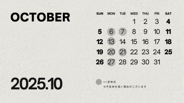 お知らせ 10月の定休日 2025-09-24 purstaff http://purhair.net/wp-content/uploads/2021/08/PUR_2021logo238.jpg PUR (ピュール) 富山県富山市の美容室 美容院 6,13,20,27日(毎週月曜) 7,21日(第1・3火曜) をお休みとさせていただきます。 ※上記以外に臨時休業をいただく場合がございます。 その際はLIN …
